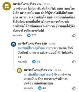 ชาวเน็ต 1 : เอาจริงๆนะ ไม่รู้นางมีแฟนใหม่รึยัง แต่นางคบใคร นี่เสี่ยงทายเลยไม่รอด ต่อให้ผู้ชายไม่มีเมียก็รอดยาก เพราะนางความคิดโครตบ้ง เหมือนเด็กสก๊อยที่เติบโตมาจากพื้นที่ห่างไกลทางการศึกษาอ่ะ ลำดับจิตใต้สำนึกค่อนข้างต่ำมาก ผู้ชายพอได้รู้จักตัวตนจริงๆก็ยากจะรับได้